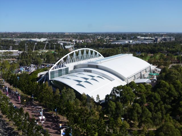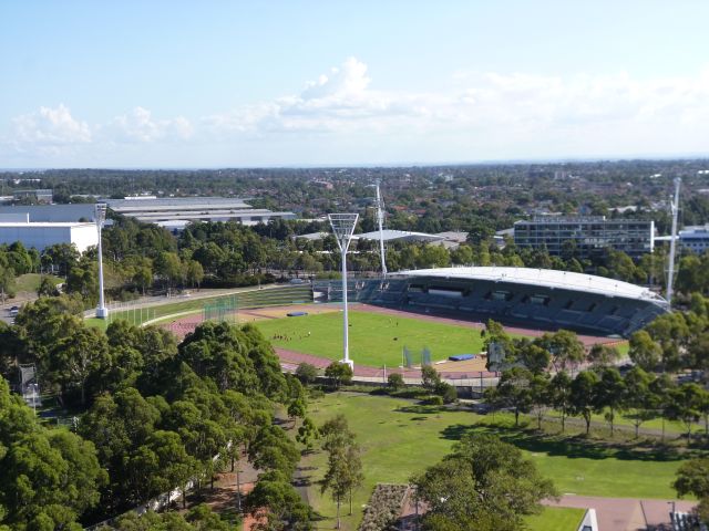 Wir schauten noch die Sportstätten in der Umgebung an. Dabei kam Götz mit einem der Wachleute ins Gespräch. Er gab uns den Hinweis, dass das nahegelegenen Novotel für seine Gäste eine Besucherplattform habe. Von dieser habe man eine prima Aussicht auf das Olympiagelände. Wenig später standen wir auf einem Balkon im 8. Stock des Hotels und genossen den Blick aufs Gelände und auf die Skyline Sydneys.
