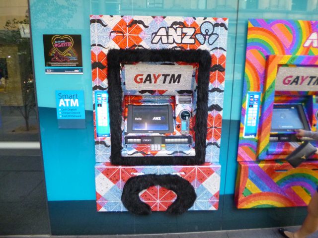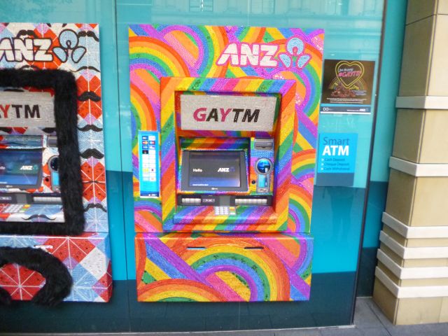 Die australische ANZ Bank hat anlässlich der “Sydney Gay and Lesbian Mardi Gras Parade” (größte Schwulen- und Lesbenparade der Südhalbkugel) zehn Geldautomaten (ATM) im Stadtgebiet in sogenannte GAYTM umgebaut.