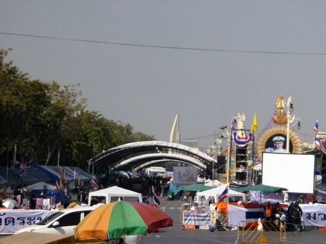 Unweit des Nationalmuseums gab es eine politische Kundgebung aus Protest gegen die amtierende Regierung. Dies war das erste und einzige Mal, dass wir die politischen Unruhen unmittelbar wahrnahmen. Die Proteste waren friedlich und wir fühlten uns zu keiner Zeit bedroht oder gar gefährdet. Dennoch vermieden wir einen unnötig langen Aufenthalt und zogen rasch weiter zum 79 Meter hohen “Goldenen Berg” Wat Saket.