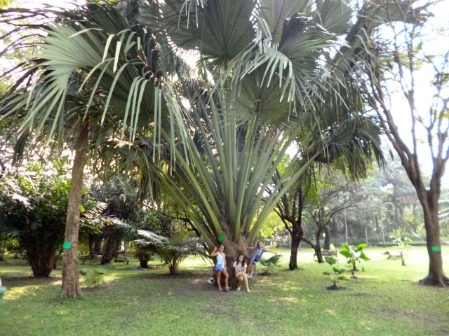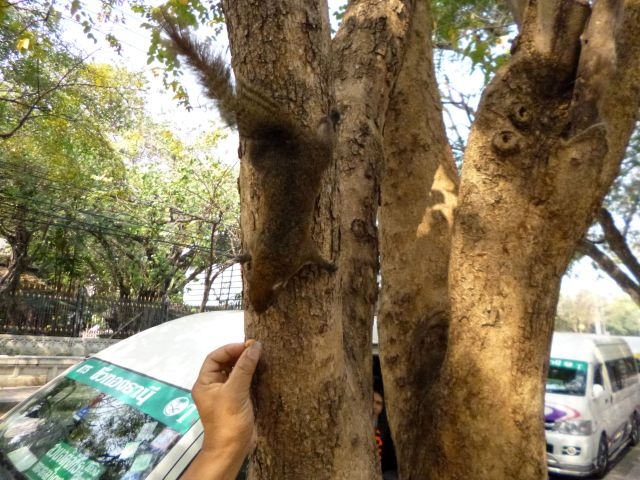 Da wir als nächstes Ziel den Norden Thailands anvisierten, mussten wir uns um entsprechende Bustickets kümmern. Was zunächst einfach klang wurde, dann doch etwas komplizierter, da Bangkok nicht nur über einen Busbahnhof verfügt. Je nach dem, welche Region Thailands bereist werden soll, ändern sich die Busbahnhöfe. Letztlich fanden wir heraus, dass der Busbahnhof Mo Chit in der Nähe des Chatuchak Weekend Markets für uns der Richtige ist. Unbedarft nahmen wir die Bahn und fuhren zur Haltestelle Mo Chit. Auf einem Lageplan konnten wir dann schon den Busbahnhof sehen. Wir mussten aber noch satte zwei Kilometer durch einen Park laufen…im Idealfall. Etwa drei Kilometer sind wir dann tatsächlich gelaufen. Das lag auch daran, dass wir mehrere Passanten nach dem Weg fragten und zum Teil sehr widersprüchliche Antworten erhielten. Wir waren ja bereits gewarnt, dass manche Asiaten lieber irgendwas erzählen, bevor sie zugeben, dass sie keine Ahnung haben. Dies wäre ja ein Gesichtsverlust. Gleichwohl war uns damit nicht geholfen. Also irrten wir latent planlos durch den Park und lernten so zufällig die “wilde” Seite Bangkoks kennen. Zuerst trafen wir auf ein paar vorwitzige Eichhörnchen, die den Kindern Nüsse aus der Hand fraßen.