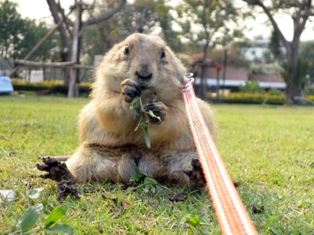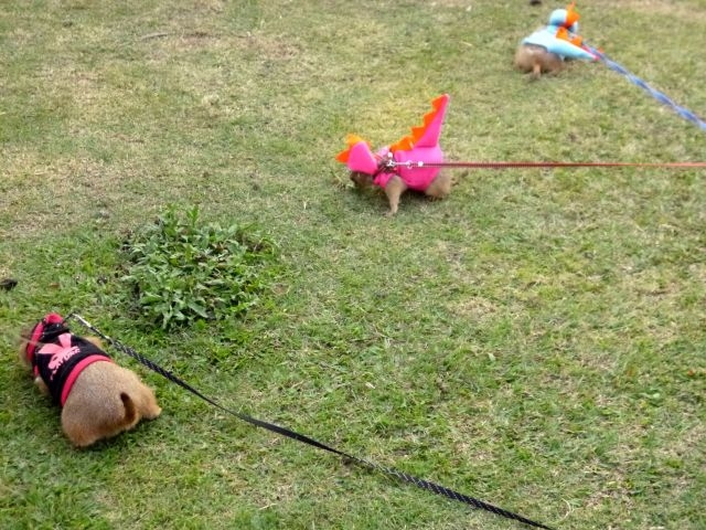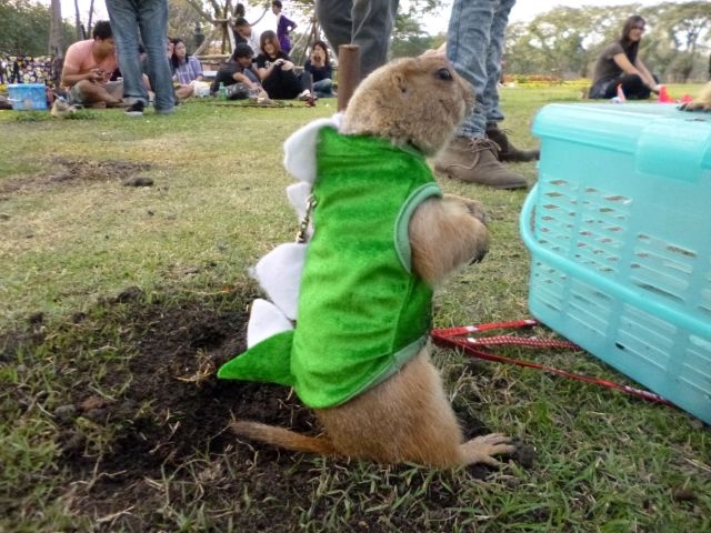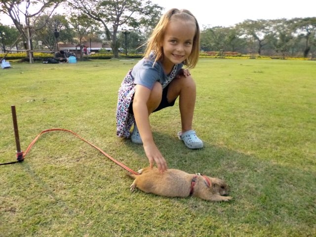 Schlussendlich kamen wir am Busbahnhof an, kauften die Tickets und machten uns auf den Rückweg. Dabei legten wir noch einen Abstecher zu einem Kinder-Mit-Mach-Museum (wer die korrekte Schreibweise kennt, kann sich ja mal melden) am Rande des Parks ein. Das Museum war allerdings geschlossen…vermutlich schon seit Jahren. Dennoch war der Weg für die Kinder nicht gänzlich umsonst, denn direkt neben dem Eingang krabbelten possierliche Nager angeleint und verkleidet (!) über den gemähten Rasen. Wir dachten im ersten Moment, dass man hier für kleines Geld mit den Tieren spazieren gehen kann und sich deshalb eine kichernde Menschentraube bei den pelzigen Gesellen gebildet hat. Stattdessen wurden wir zufällig Zeugen eines Treffens von Murmeltier-Liebhabern, die ihre Haustiere gerne als Rotkäppchen, Drache, Godzilla oder Superheld verkleiden.