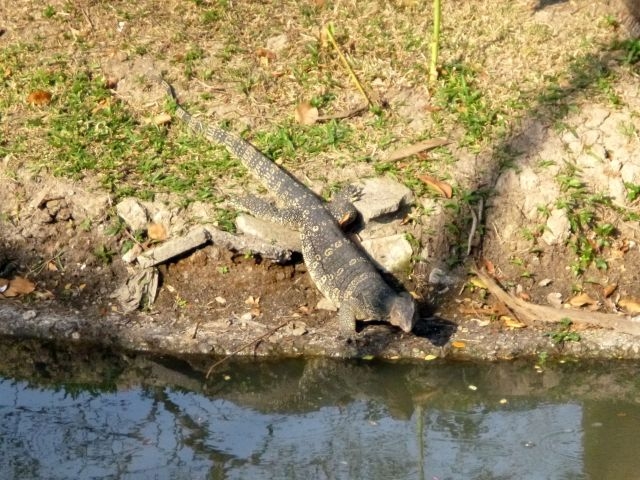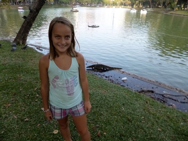 Eine irritiert dreinblickende Lilli fragte wenige Minuten später Götz, ob es denn in Bangkok Krokodile gäbe, weil sie glaubte eins gesehen zu haben. Götz verneinte, doch das war keinesfalls eine Beruhigung. Also hielten wir in diesem öffentlichen Park nach einem kleinen Krokodil Ausschau. Kurz darauf entdeckte Lilli das Reptil erneut. Das Krokodil entpuppte sich als stattlicher Bindenwaran (Monitor Lizard) von etwa 1,7 Metern Länge.