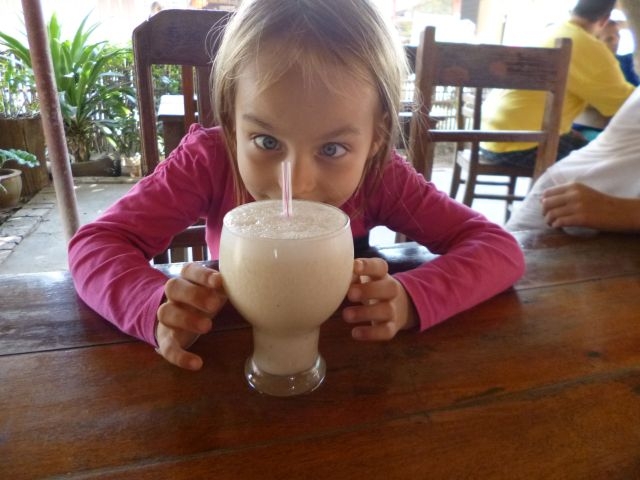 In Pakse buchten wir über unser Hotel Bustickets zu den “4000 Inseln” nahe der kambodschanischen Grenze. Dabei machte er uns ein verlockendes Angebot als er meinte für Elisa müssten wir nicht bezahlen, da sie noch so klein sei. So buchten wir also vier Tickets für fünf Personen. Doch das vermeintlich gute Geschäft wurde zu einer körperlichen Belastungsprobe. Denn wer kein eigenes Ticket besitzt hat auch keinen Anspruch auf einen Sitzplatz. So saßen zwölf Backpacker eingepfercht in einem Mini-Van, der lediglich für elf Fahrgäste leidlich Platz bot. In den darauf folgenden vier Stunden wanderte Elisa regelmäßig von Kerstins auf Götz Schoß und wieder zurück. Dabei wurden die ausgelutschten Stoßdämpfer bei fast jeder größeren Bodenwelle überfordert und der Mini-Van gab unsanft die schlechten Fahrbahnverhältnisse an die “dankbaren” Fahrgäste weiter. Überflüssig zu erwähnen, dass die Klimaanlage nicht funktionierte und über das Gebläse der Lüftung Abgase ins Fahrzeug drangen.