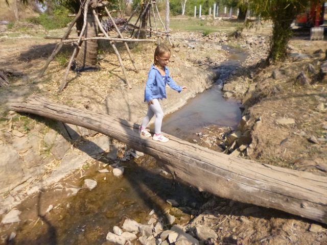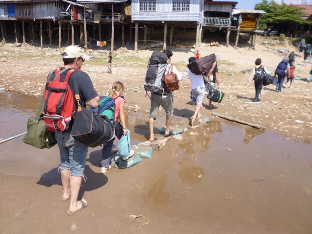 Es war uns nicht möglich eine geeignete Unterkunft im Vorfeld zu buchen. Die Favorisierten waren alle ausgebucht, darunter auch das Pa Ka Guesthouse, das uns Backpacker als auch unser Vermieter in Pakse empfohlen haben. So landeten wir auf Don Khon an und suchten auf “Gut Glück” nach einer Herberge. Kerstin und Götz schworen die Kinder auf einen aufwendigen Marsch mit Gepäck ein. Wir liefen los und die unbarmherzige laotische Sonne brannte auf uns herab. Nach schier endlosen zehn Metern erreicht wir die Rezeption des Pa Ka Guesthouse.