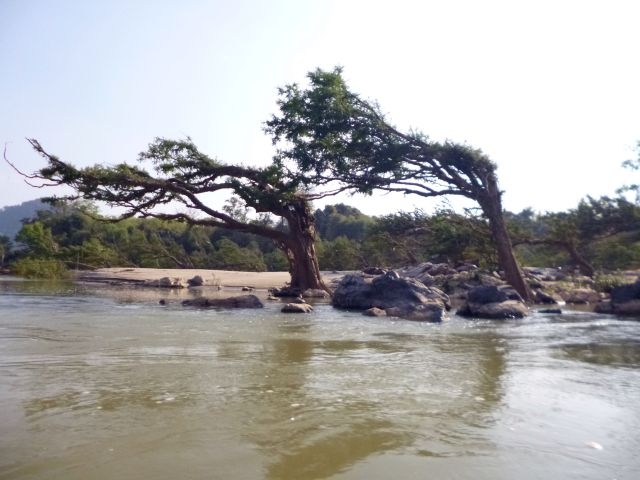 Auf dem Weg zurück wollten wir noch in Erfahrung bringen, wo und wie man am Besten die Irawadi-Delfine des Mekongs zu Gesicht bekommen könne. Etwa 20 Exemplare der seltenen Tiere sollen unterhalb der Fälle, nahe der kambodschanischen Grenze leben. Wir erfuhren, dass es bestimmte Gegenden auf dem Fluss gibt, wo sich die Delfine am frühen Morgen und am späten Nachmittag häufiger blicken lassen. Da es bereits 16 Uhr war, versuchten wir unser Glück und fragten ein paar Fischer, ob sie uns zu den Delfinen bringen könnten. Nach kurzer Verhandlung bestiegen wir ein Longboat und schon waren wir auf dem Wasser. Während der nachfolgenden Stunden zeigte sich der Mekong von seiner schönsten Seite. Der Fischer fuhr einige Zeit flussabwärts, vorbei an Stromschnellen, märchenhaften Wäldern mitten im Fluss und riesigen Felsbrocken, die von der Strömung in bizarre Kunstwerke verwandelt wurden. Doch die Delfine ließen sich zunächst nicht blicken. Unser “Capitän” war allerdings die Ruhe weg. Er steuerte schließlich eine kleine Felseninsel mitten im Fluss an, schaltete den Motor ab und bedeutete uns, an “Land” zu gehen. Das kaum mehr zehn Quadratmeter große Eiland bot gerade genug Platz für uns und eignete sich hervorragend als Ausguck.