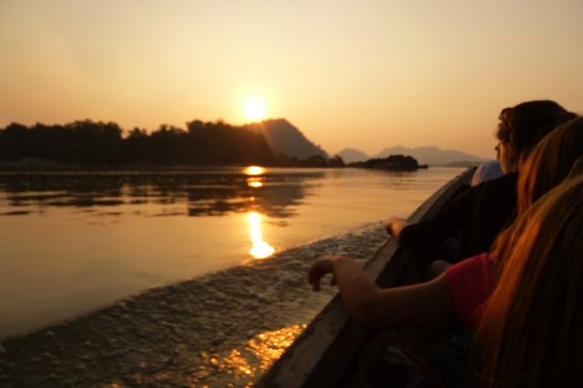 Ein unwirkliches Erlebnis, mitten in diesem gewaltigen Fluss auf dieser winzigen Insel im Niemandsland zu sitzen… hunderte Meter vom laotischen und kambodschanischen Ufer entfernt…vor uns die Delfine hinter uns der Wasserfall. Unbeschreiblich. Wir verbrachten mehrere Stunden auf dem Mekong, bevor wir uns auf den Rückweg machten. Dabei durften wir noch den Sonnenuntergang mitten auf dem Fluss genießen.