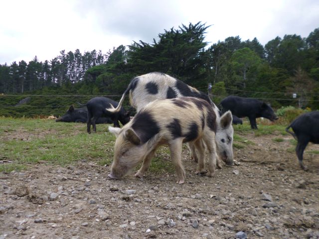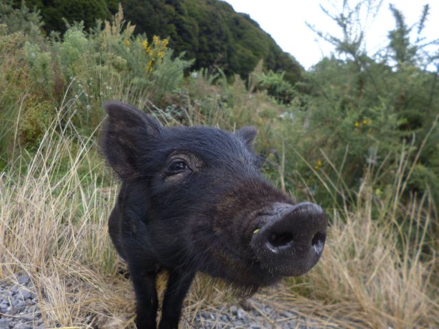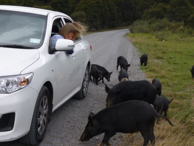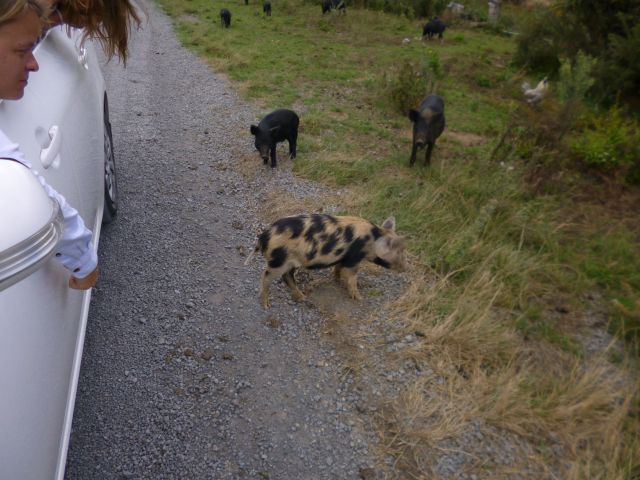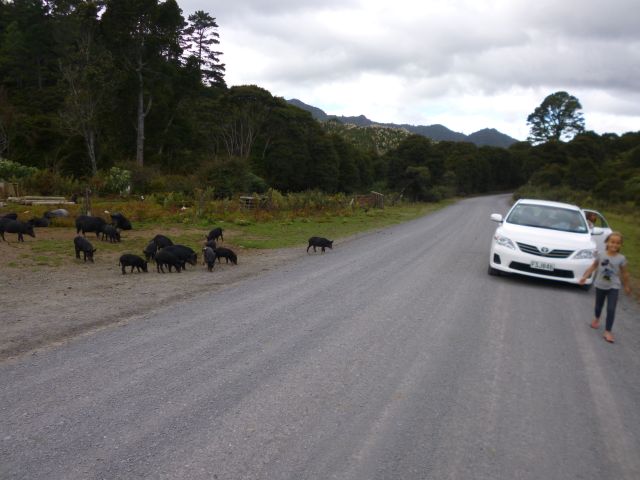 Nach einigen Kilometern wurde unsere Fahrt dann jäh unterbrochen. Sehr zur Freude der Kinder blockierte eine Horde freilaufender Schweine die Fahrbahn. Götz stieg aus dem Wagen und suchte an einem kleinen Farmhaus am Straßenrand nach einem offenen Gatter. Doch offenbar werden die borstigen Vierbeiner von ihrem Besitzer mit viel Gottvertrauen gehalten…es gab kein Gatter! So machte eine Schweinehorde einen Highway zum Saustall.