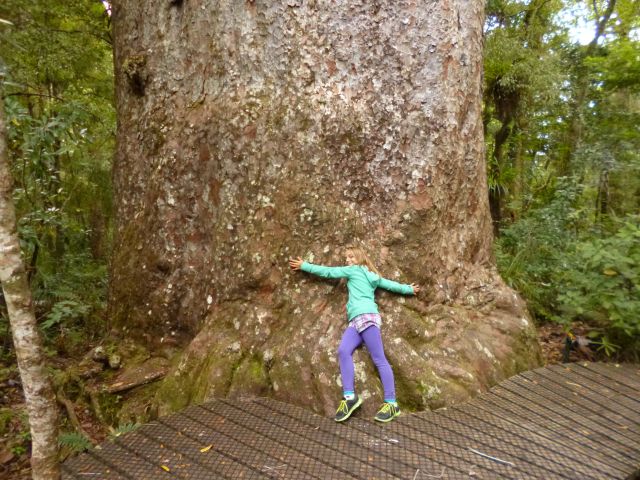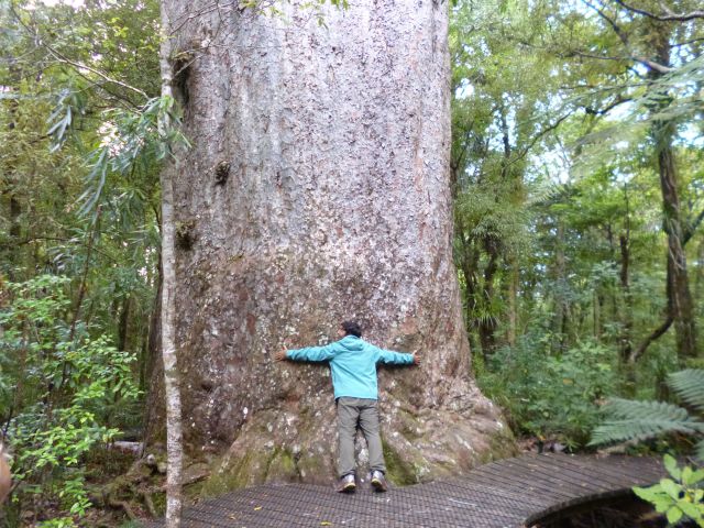 …doch aus der Nähe betrachtet ist Tãne Mahuta geradezu unwirklich. Sein Alter wird auf etwa 2000 Jahre geschätzt. Der gewaltige Stamm hat einen Umfang von fast 14 Metern und bringt es auf satte 245 Kubikmeter Holz. Zusammen mit den Ästen, türmten sich mehr als Kubikmeter Holz vor uns auf. Damit kommt man auf alle Fälle durch einige kalte Winter. Auch ein Baumhaus mit Fahrstuhl wäre denkbar.