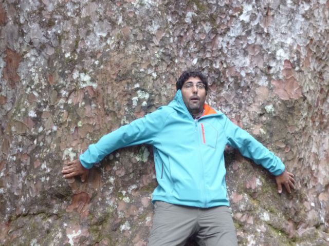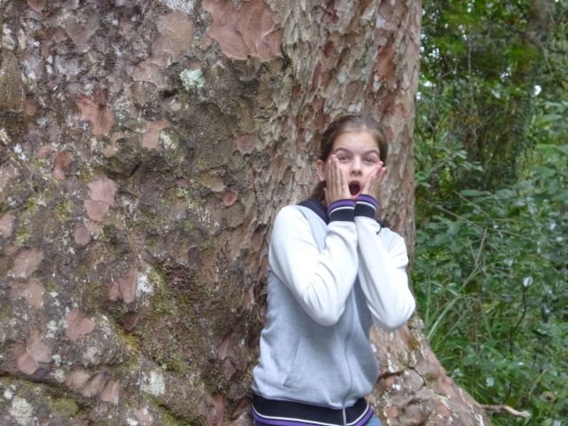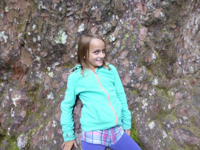 Nach kurzem Weg lichtete sich das Blattwerk und gab den Blick auf den „Gott des Waldes“ frei. Der hölzerne Gigant erhob sich auf eine Höhe von fast 52 Meter. Doch die Höhe des Baumes ließ sich nur schwer erfassen. Bedingt durch die Entfernung und die Perspektive wirken die Kinder noch immer recht groß…