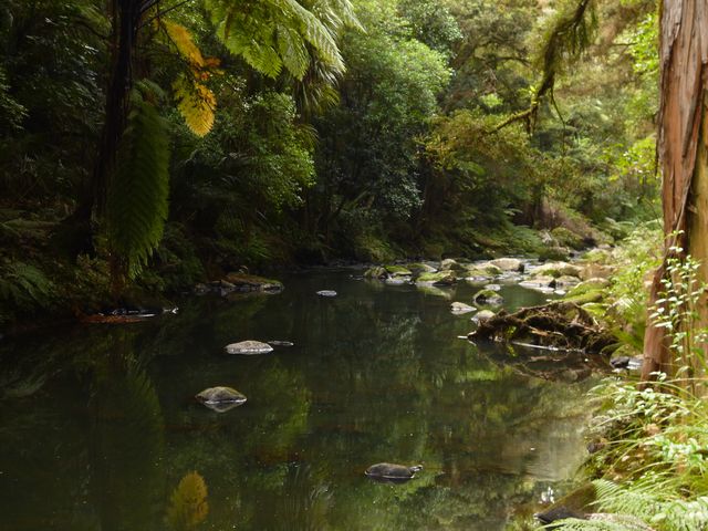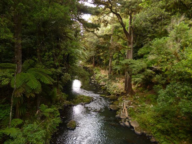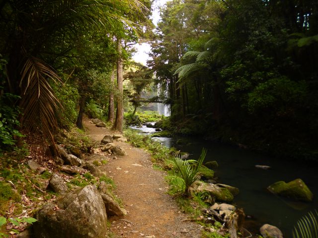 Der Wasserfall ergoss sich in einen kleinen See, dessen Ufer zum Picknicken einlud. Von hier folgten wir einem malerischen Pfad entlang eines kleinen Flusses, der sich in einem Kauri Hain verlor.