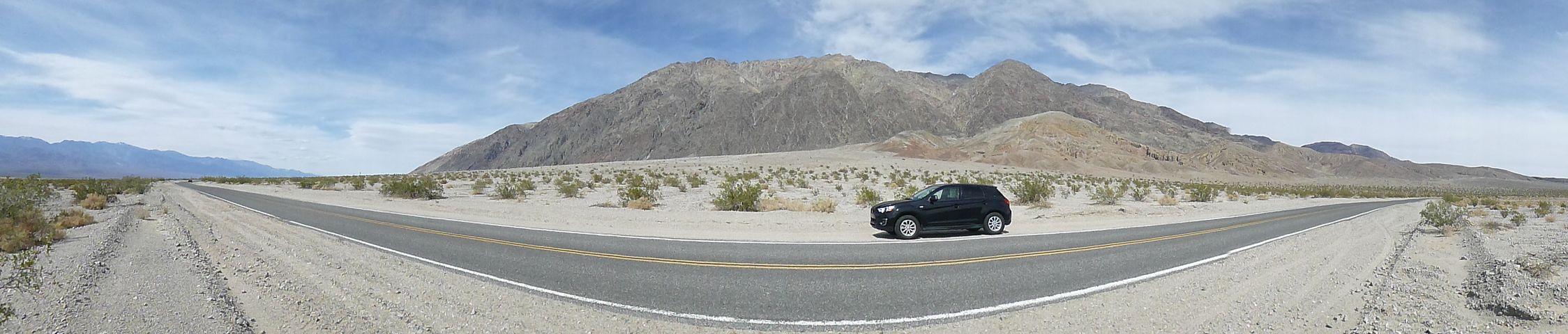 Vorbei an den Red Rocks ließen wir Nevada hinter uns und überquerten die Grenze nach Kalifornien. Kurz hinter dem Ort Shoshone – ja, hier lebte tatsächlich der Indianerstamm der Shoshonen – ging es dann noch einen kurzen Anstieg hinauf zum Salsberry Pass auf rund 1.000 Meter über dem Meeresspiegel. Wir hatten das Tal des Todes erreicht. Während im Auto aus den Lautsprechern der AC/DC Klassiker „Highway To Hell“ dröhnte, führte uns die sanft abfallende Straße zur Talsole des Death Valley. Mächtige Berketten, die bis zu 3.300 Meter aufragen, säumen das Tal zu beiden Seiten, während die Talsole selbst auf etwa Meereshöhe liegt.