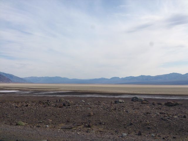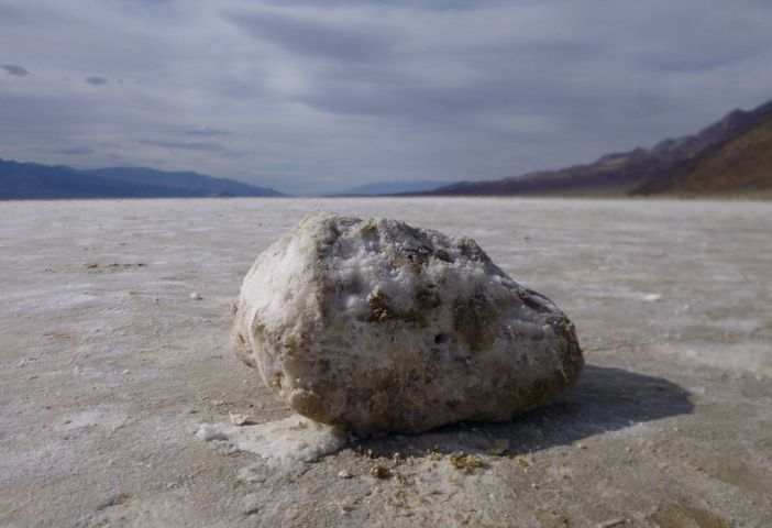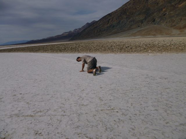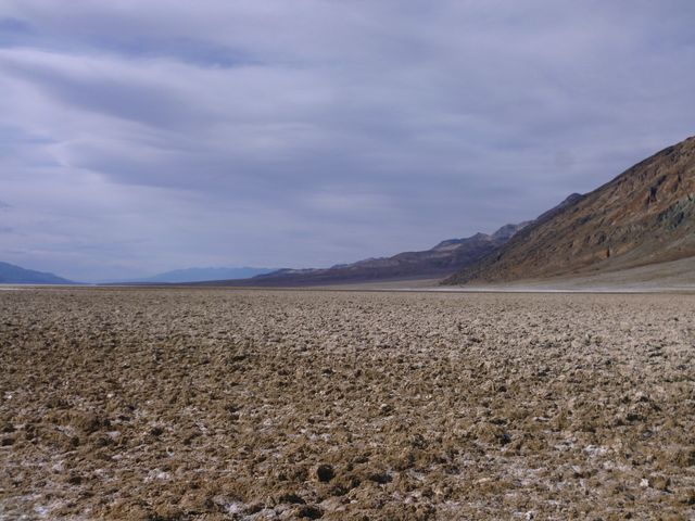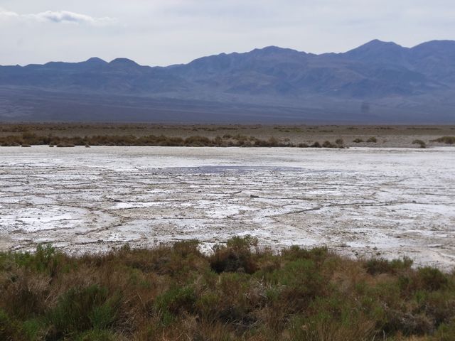 Die Senke des Badwater Basin ist mit 85,5 Metern unter dem Meeresspiegel nicht nur der tiefste Punkte im Death Valley, sondern auch der tiefste Punkt des gesamten nordamerikanischen Kontinents! Hier sammeln sich die sagenhaften Regenfluten und bilden mit einer kleinen Quelle sowas wie einen Tümpel. Die Regenfluten sind in der Tat sagenhaft selten: Death Valley: 48 mm im Jahr vs. Kornwestheim: 680 mm im Jahr.