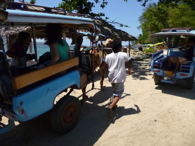 Da auf allen Gili Inseln kein einziges motorisiertes Fahrzeug erlaubt ist (Boote ausgenommen), stand uns erst einmal ein Fußmarsch bevor. Sehr zur Freude der Kinder erwarteten uns jedoch zwei kleine Pferdekutschen die uns mit samt unserem Gepäck zum Lucy’s Garden Guest House brachten.