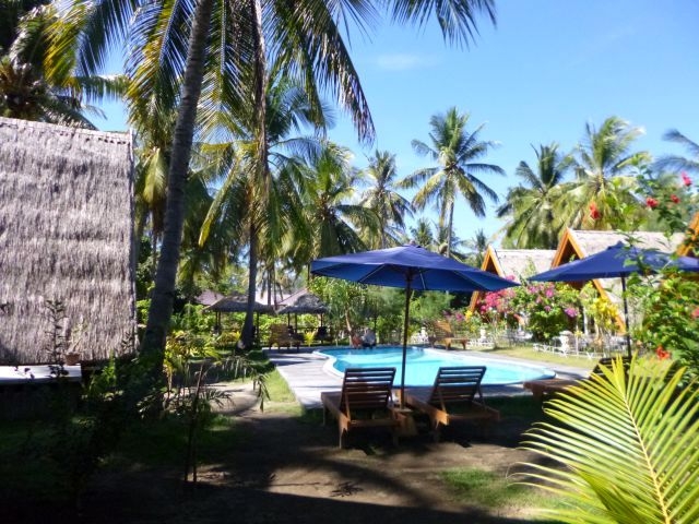 Versteckt in einem kleinen Palmenhain erwarteten uns mit Palmenblättern gedeckte Bungalows, die einen kleinen Pool umgaben. Etwa 100 Meter vom Strand entfernt und abseits der “Party Meile” fanden wir einen paradiesischen Ort… zumindest für Kerstin und Götz. Denn so schön der Ort auch ist, auch hier mussten die Kinder ihre Hausaufgaben erledigen. Dennoch blieb noch genügend Zeit, um ausgelassen zu baden.