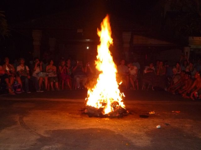 Ein Höhepunkt war sicher ein Tänzer, der mit einer Art Pferdekostüm um einen ansehnlichen Berg brennender Kokosschalen tanzte. Wie aus heiterem Himmel stieß er den brennenden Haufen um und Glut und Funken stoben in den Nachthimmel. Das plötzlich erloschene Feuer und die großflächig verteilte Glut tauchten den Schauplatz in ein dämonisches Licht, während der Tänzer – angefeuert durch den Gesang – durch die Glut tanzte… kurze Info am Rande, der gute Mann war barfuß! Durchaus ein besonderes Schauspiel.