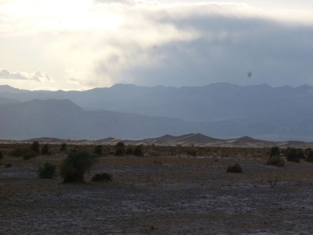 Einer voller Tank, reichlich Wasser und mit der Morgensonne im Rücken ging es auf den Weg. Unser neues Ziel war das 460 Kilometer entfernte Ridgecrest / Kalifornien. Wir wählten den langen Weg durch das Death Valley, entlang der Nord/Süd-Achse. Bereits wenige hundert Meter außerhalb von Las Vegas, wurde deutlich, warum das Spielerparadies als Wüstenmetropole bezeichnet wurde. Schlagartig wurde der Highway von einer Steppenlandschaft gesäumt. Zwischen den vereinzelten, halbvertrockneten Sträuchern müsste eigentlich jeden Augenblick John Wayne oder Winnetous Freunde auftauchen…