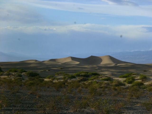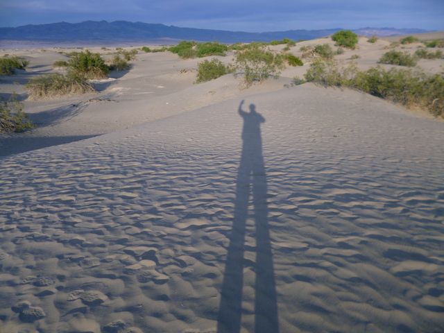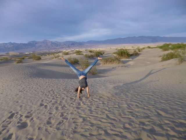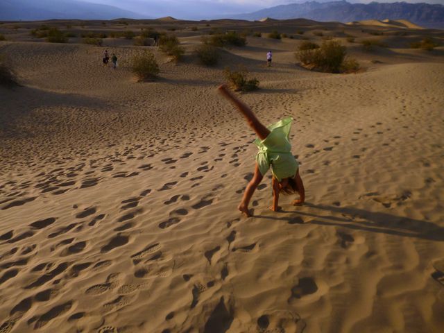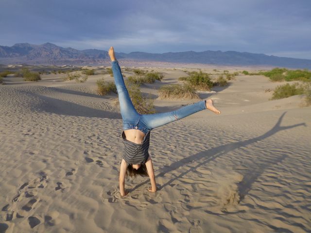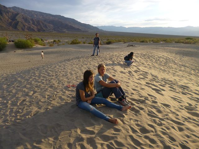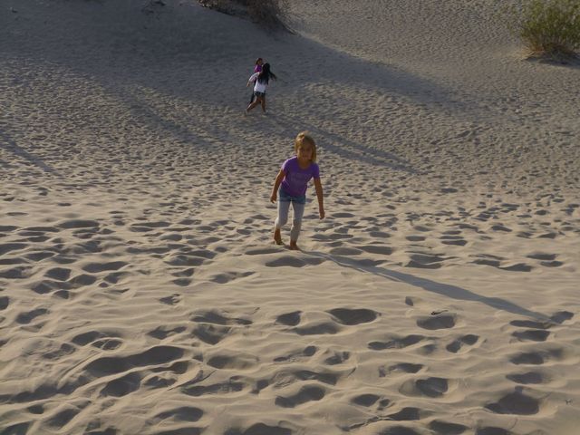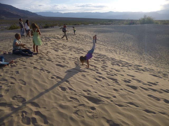 Es war bereits Nachmittag und wir hatten noch ein paar Meilen vor uns. Unser letzter Zwischenstopp sollte abschließend das gängige Klischee einer Wüste erfüllen. In den Mesquite Flat Sand Dunes konnten sich die Kinder nach der langen Fahrt noch so richtig austoben. Während Kerstin und Götz die Abendsonne genossen, schlugen die Kinder in den Dünen Räder. Bereits beim Zusehen wurde einem schon ganz schwindelig.